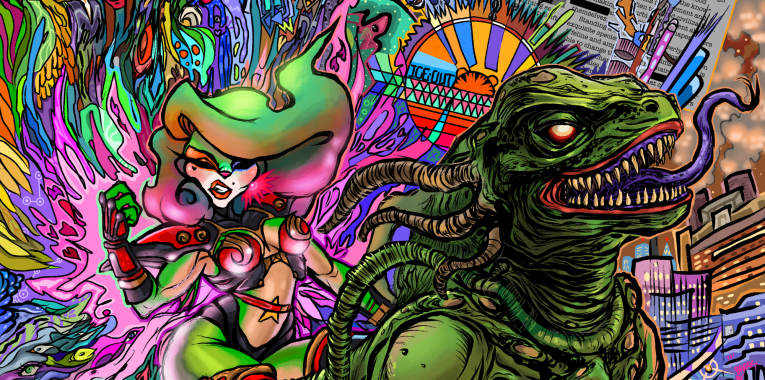 All Eyes On Me. Ive centralized this character on and off over the years. I created her from a business card I found by a pool. My friends and I thought up what this person would look like and I got to drawing. Over time this character evolved, and I felt as if this character were someone I had known before. She materialized as i fleshed her out in paint, markers, digital works of art. All of my eyes literally were, and have been, on her. I haven’t created much of any other character, she demanded most of my attention, becoming something of a signature. Whether the main subject, or lost somewhere in the maze like backgrounds I’m evolving my style around, she’s become my partner, a fictional wife of sorts… as if I knew her from another time, and this is her way of incarnating. I keep her alive, as she’s kept alive the passion to have a constant point of inspiration. I picture her here as if she is walking through a gateway into this bold, stylized contemporary universe that melds together where you’d imagine there not being an ending or beginning, yet still a capsule Ted in this boxed frame. Next level, where all seem to exist at once. This here would be an interpretation of a garden ( again). Wild, colorful, aware and alive.