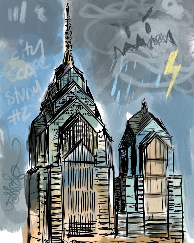 The Liberties of Philly May 7, 2019 study of two sister buildings in the skyline of Philadelphia for a commission canvas painting. Share this: Click to share on X (Opens in new window) X Click to share on Facebook (Opens in new window) Facebook Like Loading...